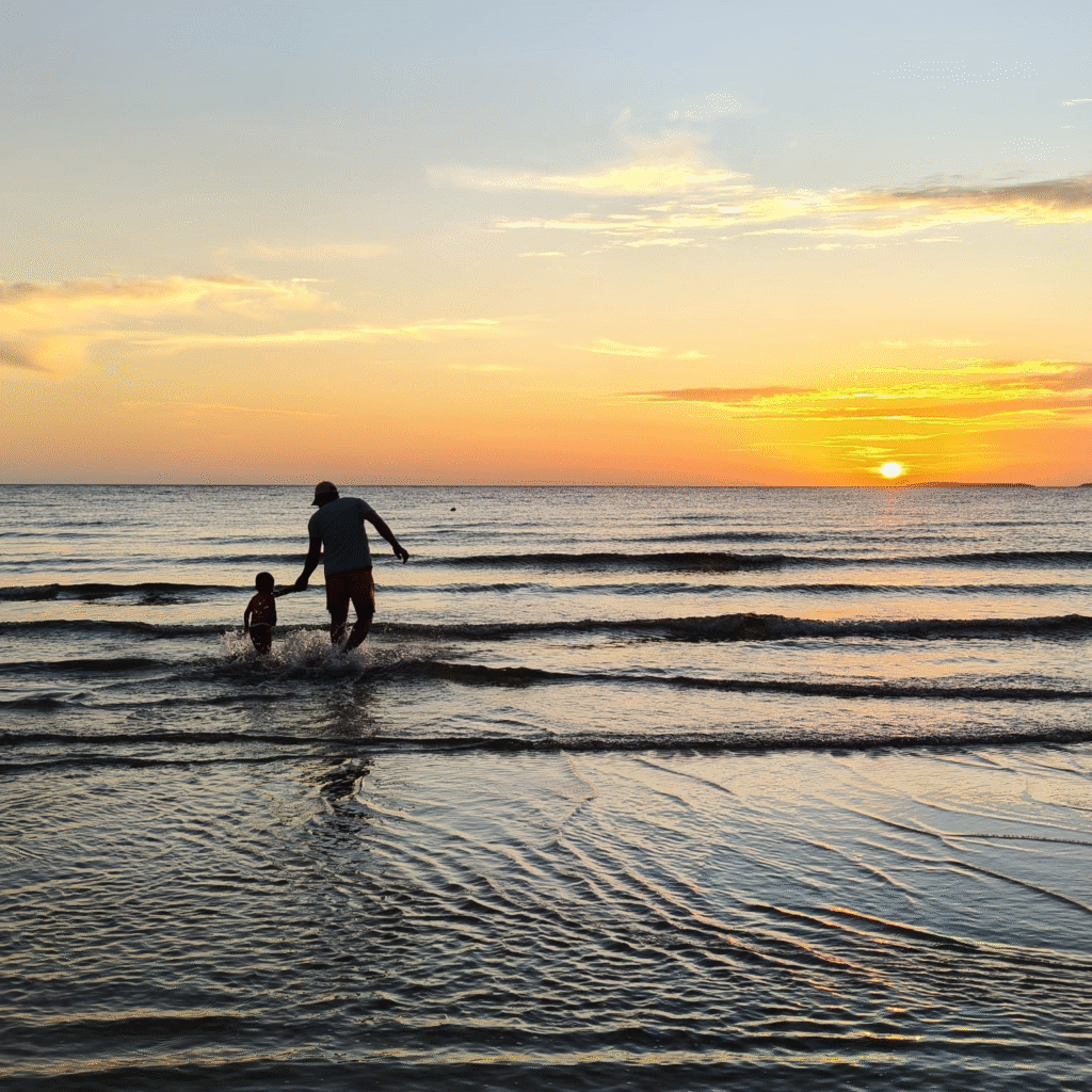 Pantai ini dikenal dengan hamparan pasir putih dan pemandangan laut biru yang memanjakan mata. Saat sore, langit di Pantai Air Mata Permai berubah jadi gradasi jingga yang menawan — cocok banget buat foto siluet atau candid alami.